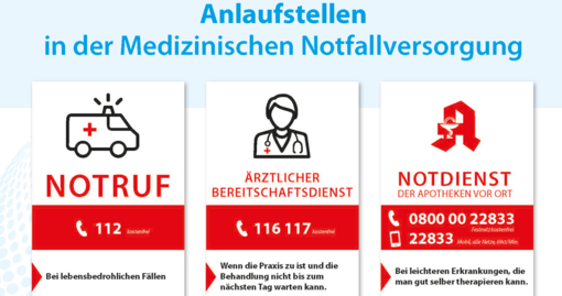 Durch die Veranschaulichung der Anlaufstellen in der medizinischen Notfallversorgung in einer Übersicht wird die Gesundheitskompetenz der Menschen bei einer Gesundheitsstörung außerhalb der Zeiten des Regeldienstes gefördert. „Betroffene können auf Grundlage ihrer jeweiligen gesundheitlichen Situation entscheiden, ob sie den Notruf bzw. die Notfallaufnahme, den ärztlichen Notdienst oder die wohnortnahe Notdienst-Apotheke in Anspruch nehmen möchten“, so Thomas Preis.