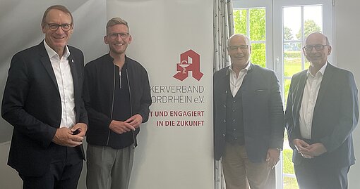 Der Verbandsvorsitzende Thomas Preis (Bild links) mit den Diskutanten der diesjährigen Klausurtagung von Vorstand und Beirat des AVNR (v.l.n.r.): Daniel Rinkert (MdB, SPD), Dr. Georg Kippels (MdB, CDU-/CSU-Bundestagsfraktion) und Dr. med. Johannes Nießen (Leiter der Bundesbehörde BIPAM und kommissarischer Leiter der BZgA).