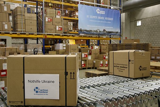 Krisenerprobte Hilfsorganisationen stellen beispielsweise spezielle Notfallpakete zusammen, die das enthalten, was am dringendsten benötigt; hier am Beispiel „action medeor“. (Bildquelle: action medeor e.V.)