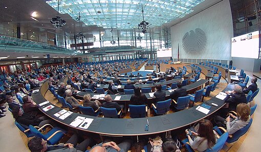Die Podiums- und Plenardiskussion mit den Vertretern der Bundestagsfraktionen findet im Plenarsaal des ehemaligen Deutschen Bundestages in Bonn statt. (Quelle Alois Müller/AVNR)