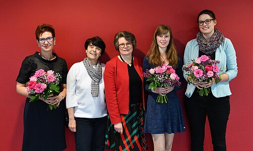 Freuten sich über die Preisverleihung (v.l.n.r.): Maryna Deschmann, Dr. Ingrid Sukop, Dr. Gudrun Schulte Herbrüggen, Isabel Kirchner, Jacqueline Margis (alle PTA-Fachschule Niederrhein). Die weiteren Preisträgerinnen konnten nicht an der Preisverleihung teilnehmen.